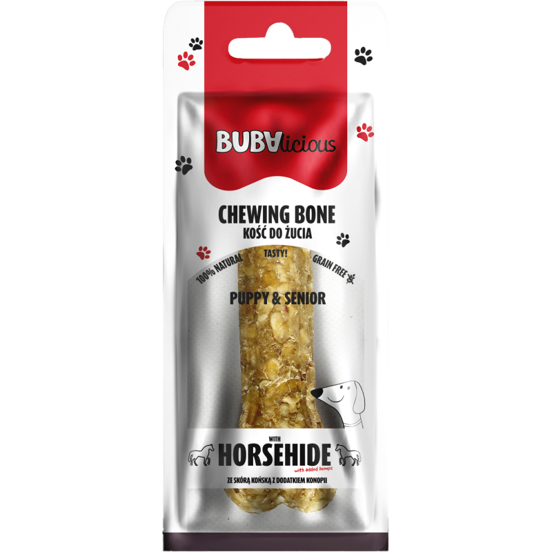 Pyszna i zdrowa kość do żucia ze skóry wołowej, z dodatkiem skóry końskiej i konopi. Produkt przeznaczony dla psów w każdym wieku, także szczeniąt oraz seniorów wszystkich ras powyżej 5kg, o długości 12cm.